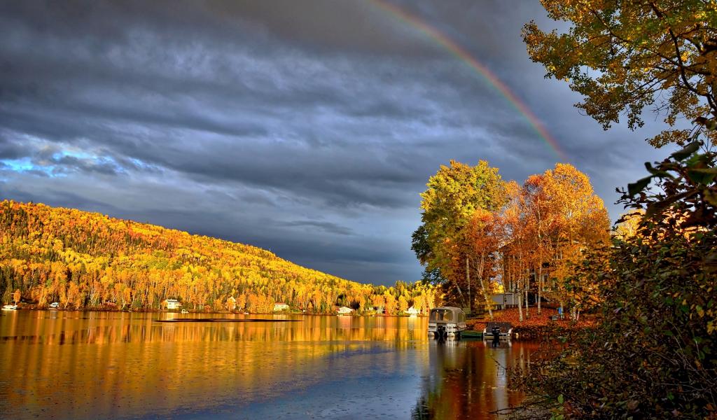 Wallpaper Rainbow in the cloudy sky above the lake near the autumn forest