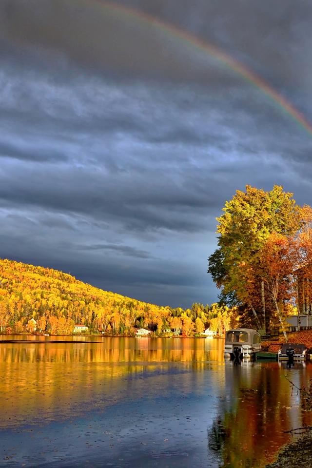 Wallpaper Rainbow in the cloudy sky above the lake near the autumn forest
