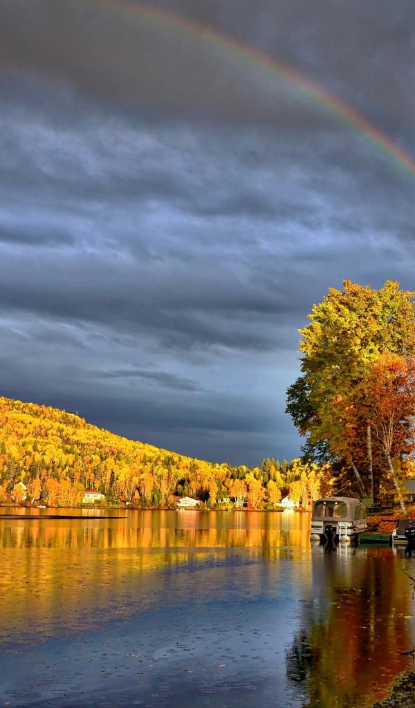 Wallpaper Rainbow in the cloudy sky above the lake near the autumn forest