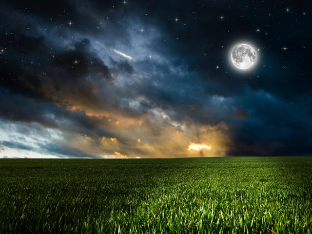 Wallpaper Green field under a beautiful sky with a bright moon at night