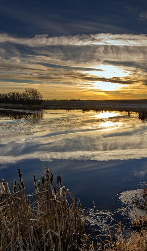 Wallpaper White clouds reflected in the water at sunset
