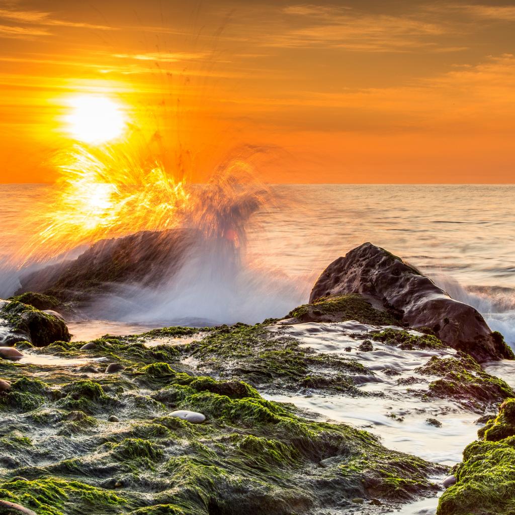 Wallpaper The surging waves in the sea are beating against the stones at sunset
