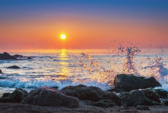 Wallpaper Waves are beating against the rocks on the sea coast at sunset