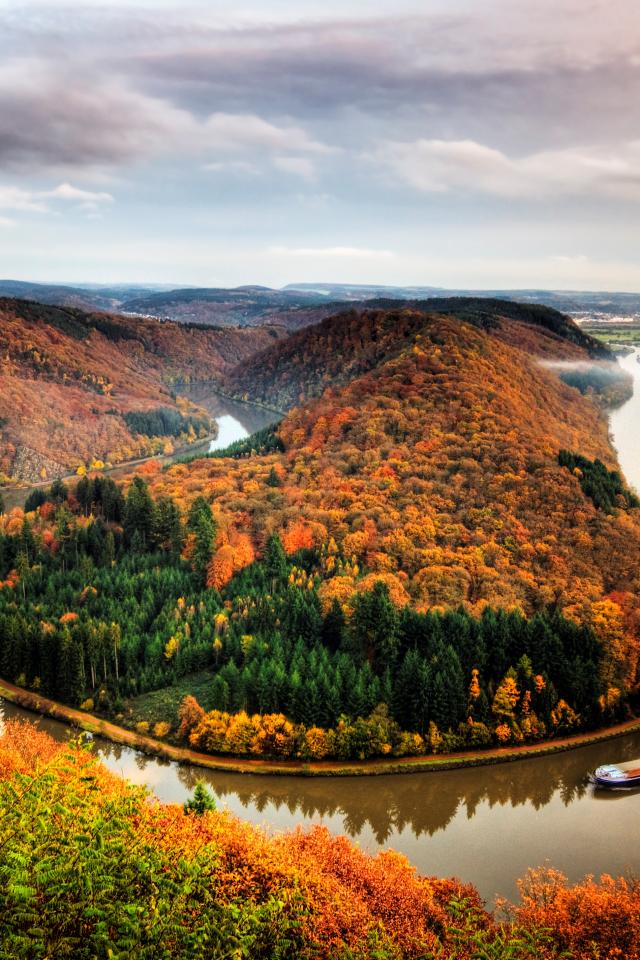 Wallpaper River next to an autumn forest against a cloudy sky background