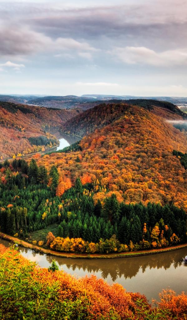 Wallpaper River next to an autumn forest against a cloudy sky background