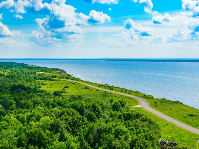 Wallpaper Road through the coast along the sea under a blue sky with white clouds