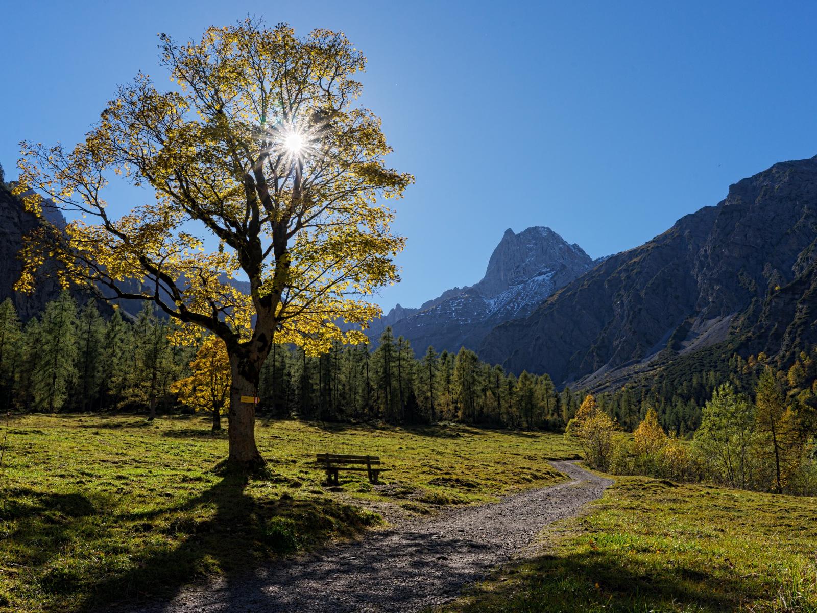 Wallpaper Tree with green leaves in the sun against the backdrop of the mountains