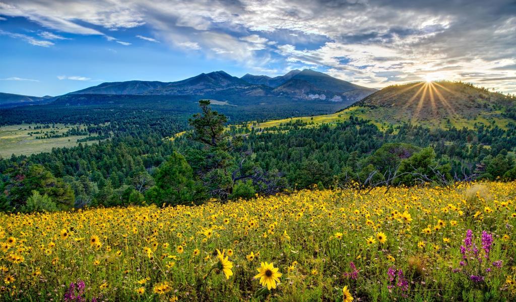 Wallpaper Sunrise over mountains, forest and field with yellow flowers