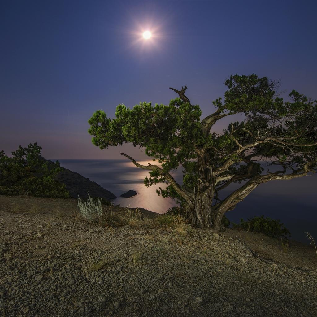 Wallpaper A large green tree on the shore of a cliff by moonlight at night