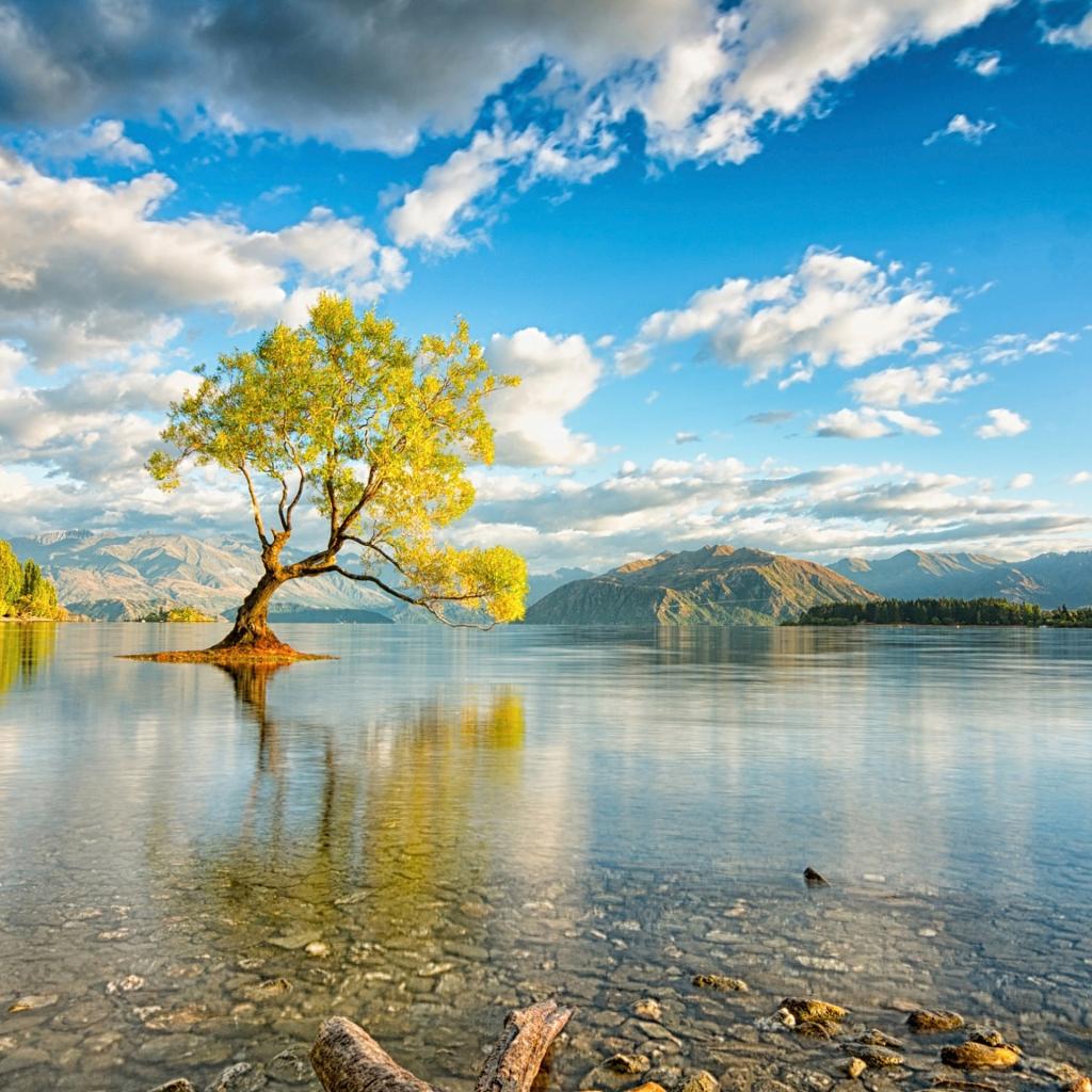 Wallpaper A tree in the middle of a lake under a beautiful sky with white clouds