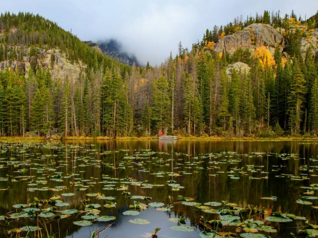 Wallpaper Lake against the backdrop of a pine forest at the foot of the mountains