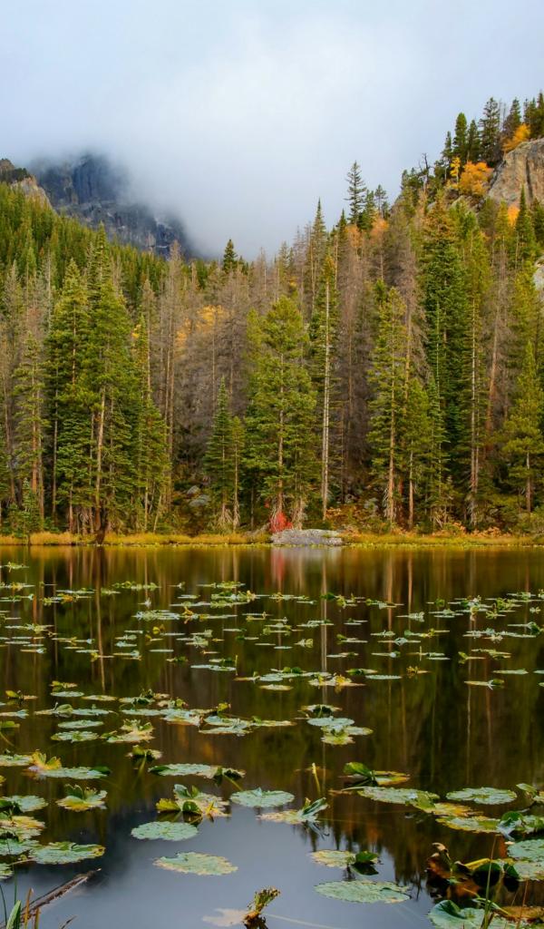 Wallpaper Lake against the backdrop of a pine forest at the foot of the mountains