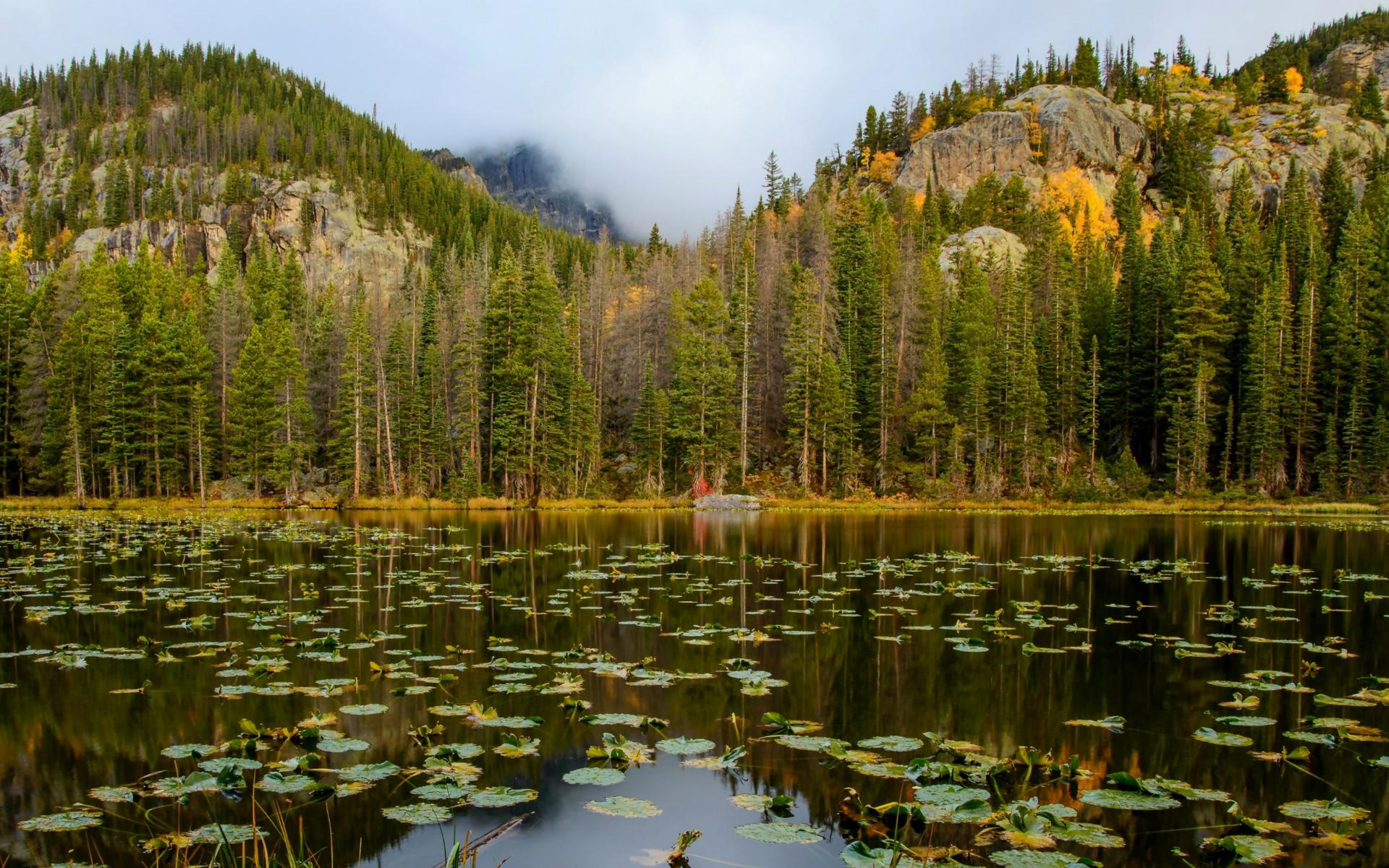 Wallpaper Lake against the backdrop of a pine forest at the foot of the mountains