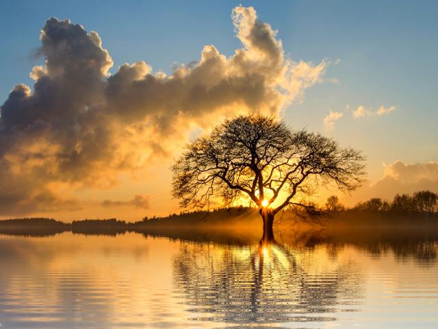 Wallpaper The sun breaks through the branches of a tree in the cloudy sky
