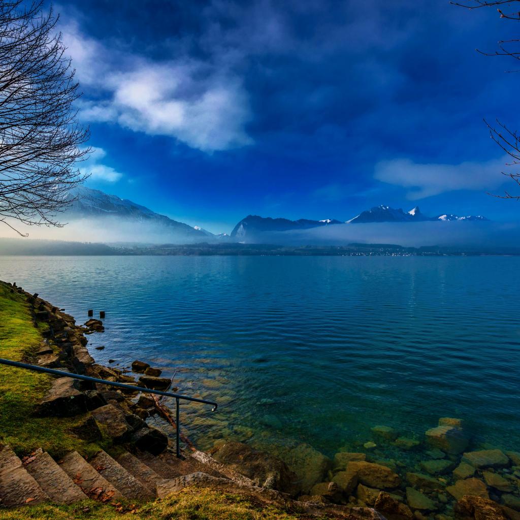 Wallpaper Fog over the lake in the background of the mountains