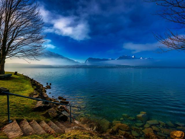 Wallpaper Fog over the lake in the background of the mountains