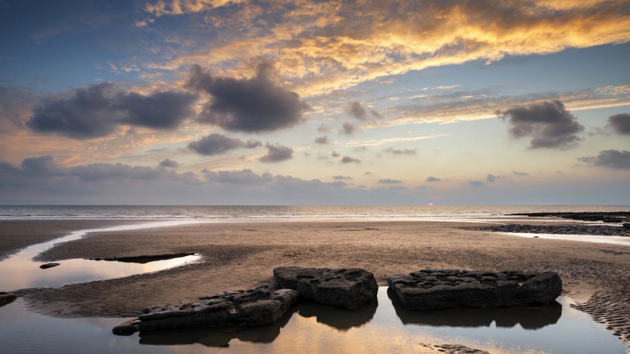 Wallpaper Large stones in the water on the sand under the beautiful sky