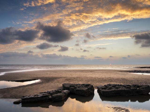 Wallpaper Large stones in the water on the sand under the beautiful sky