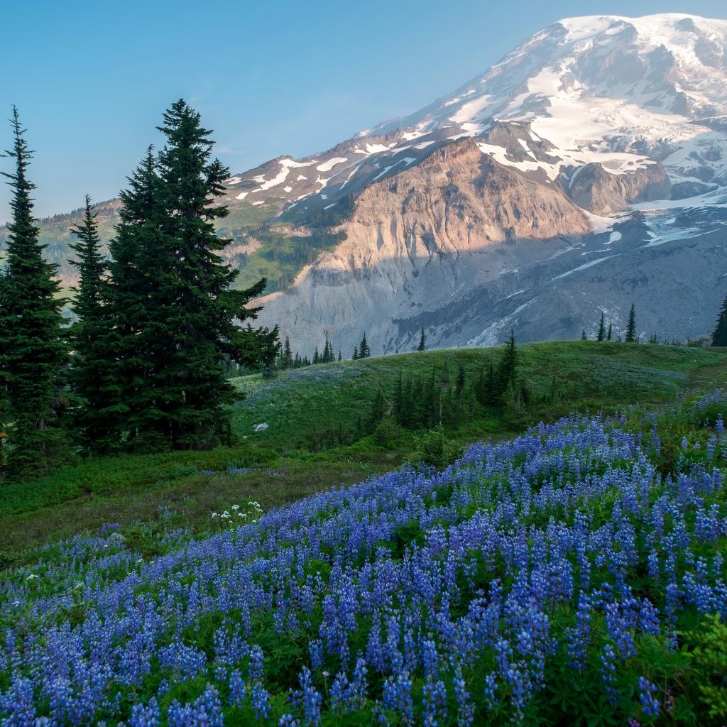 Wallpaper Blue lupine flowers in a forest against the backdrop of mountains