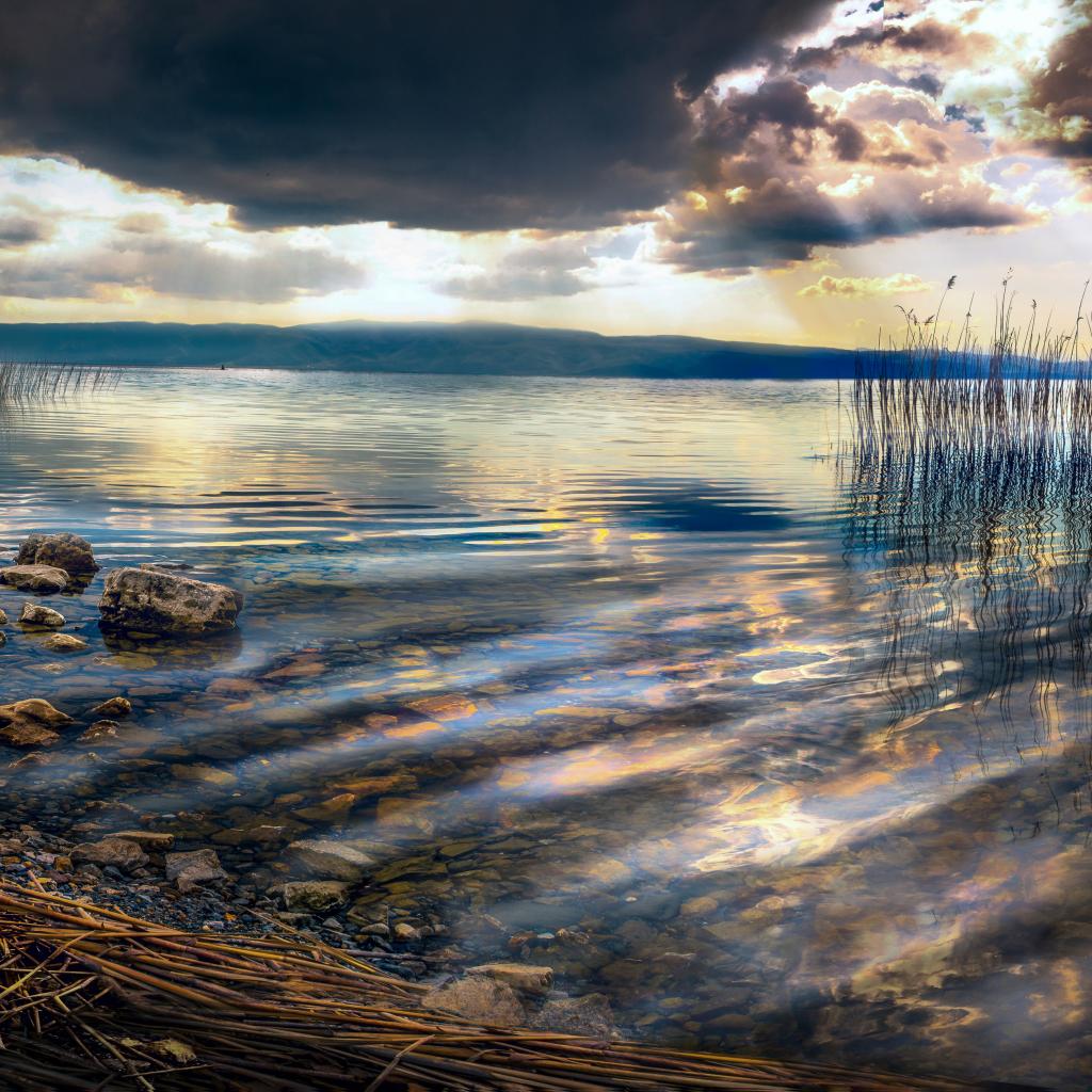 Wallpaper Stones in the lake under the beautiful sky at sunset