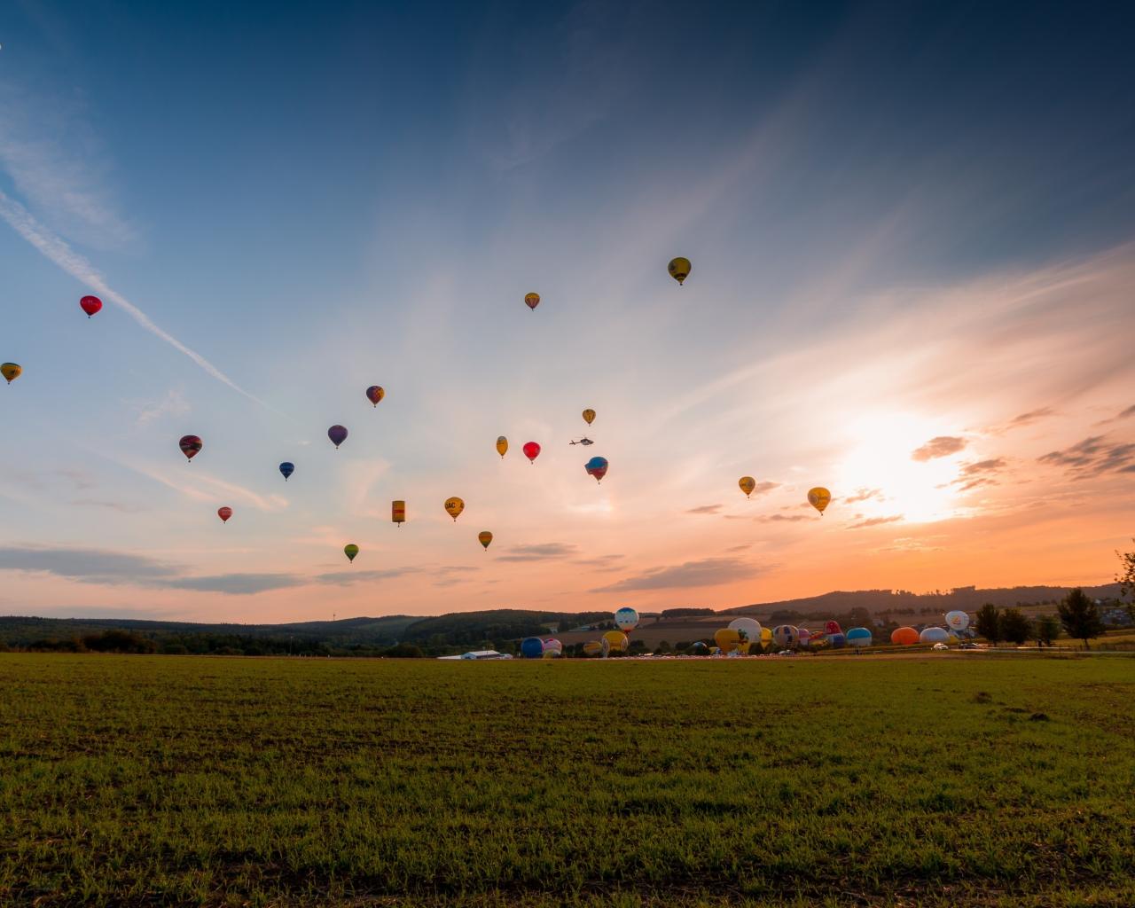 Wallpaper Balloons in the sky above the green field