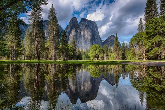 Wallpaper Stone rocks and forest are reflected in the water