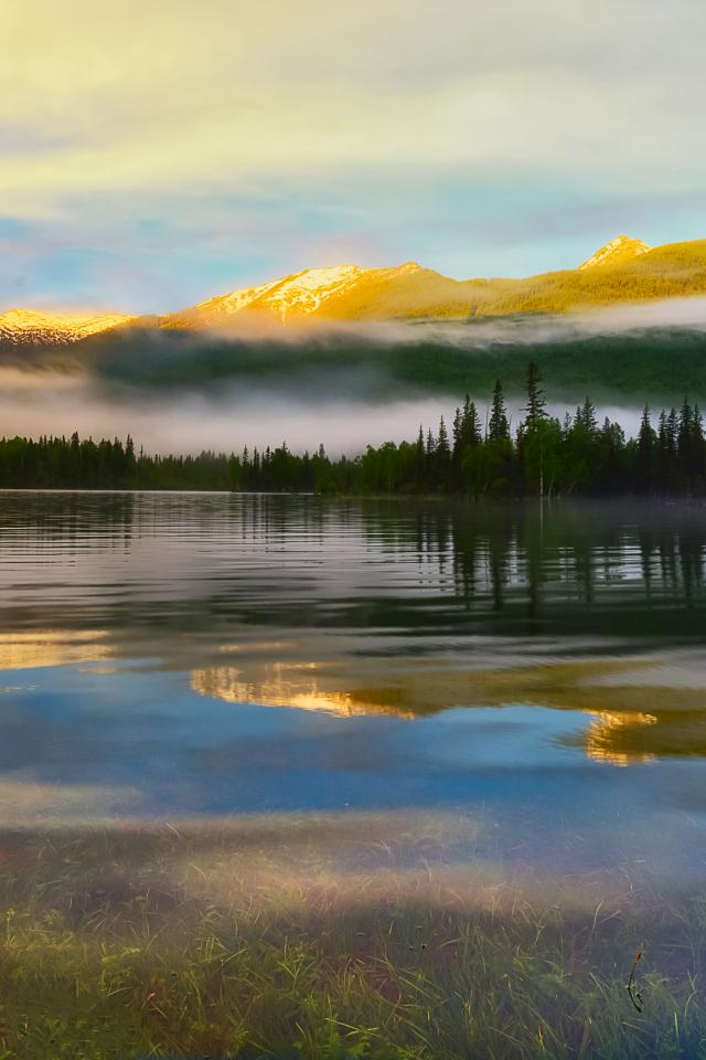 Wallpaper Morning mist over the water at sunrise in the mountains