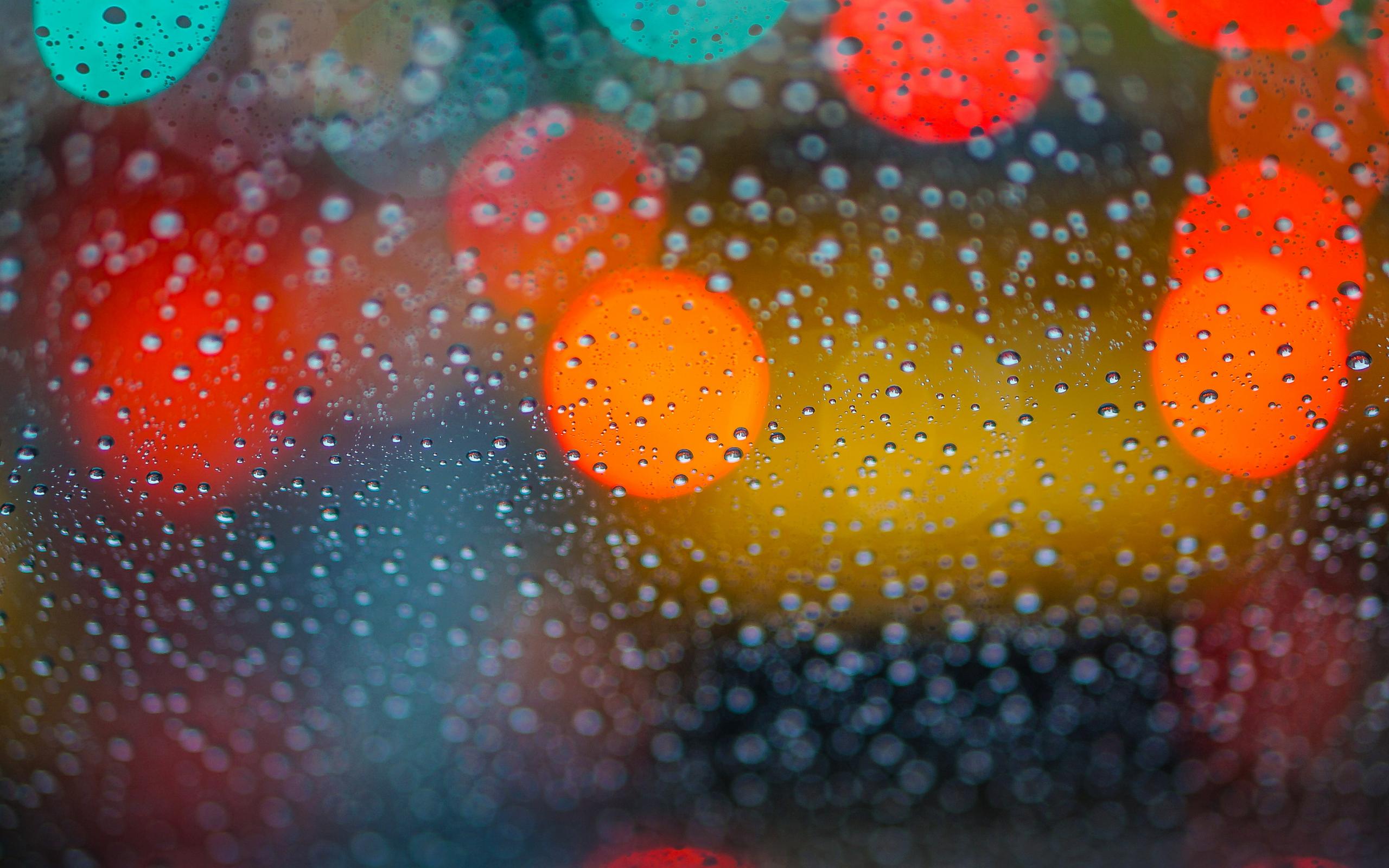 Wallpaper Drops of rain on the glass with multicolored highlights