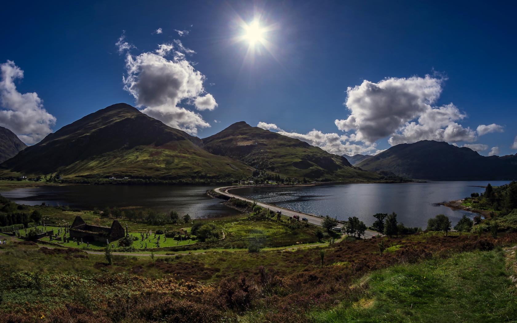 Wallpaper Bright sun in the blue sky over the mountains by the river