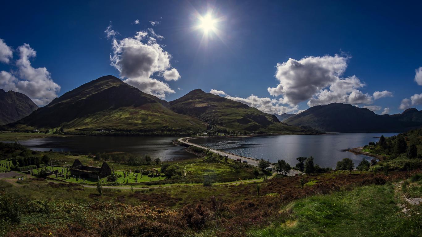 Wallpaper Bright sun in the blue sky over the mountains by the river