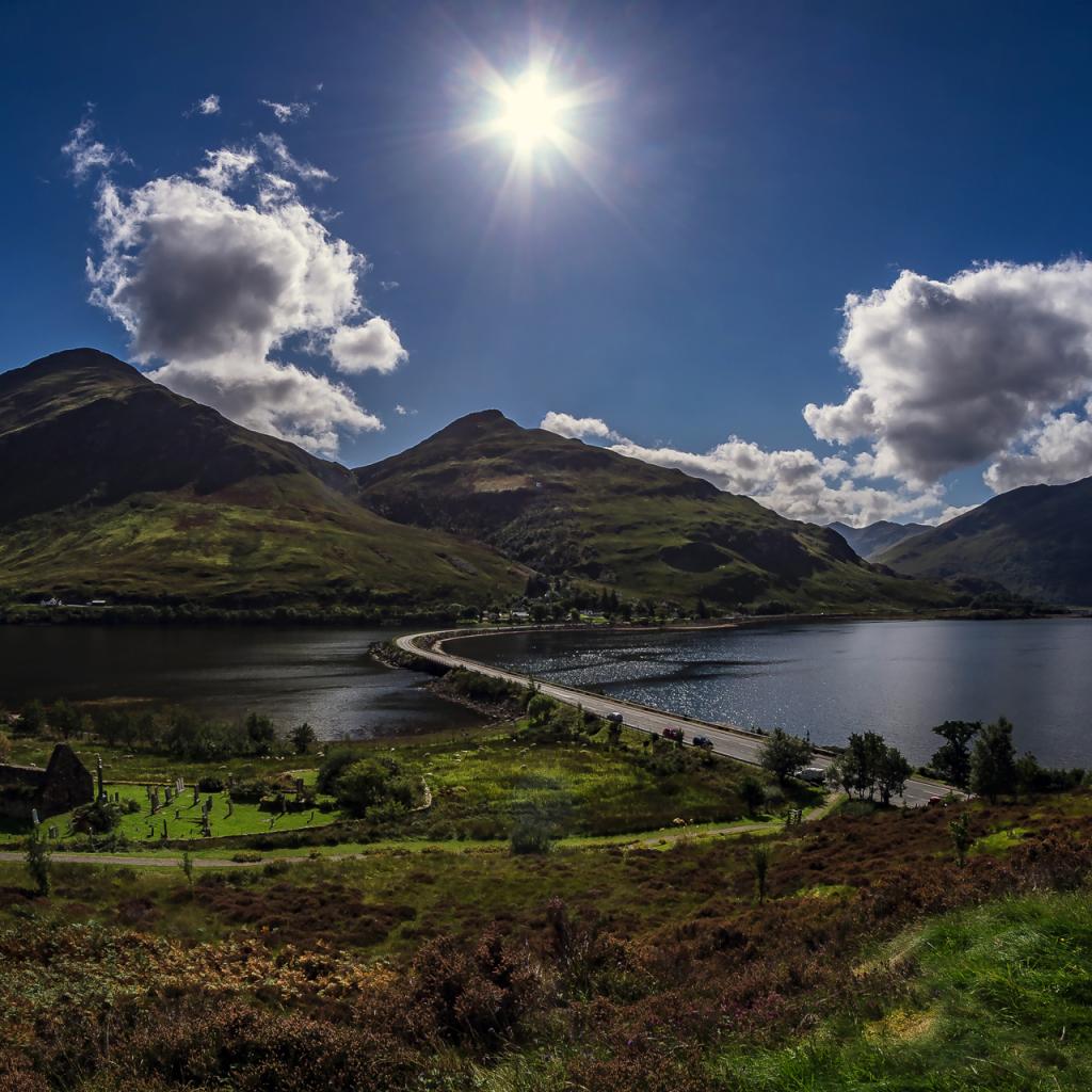 Wallpaper Bright sun in the blue sky over the mountains by the river