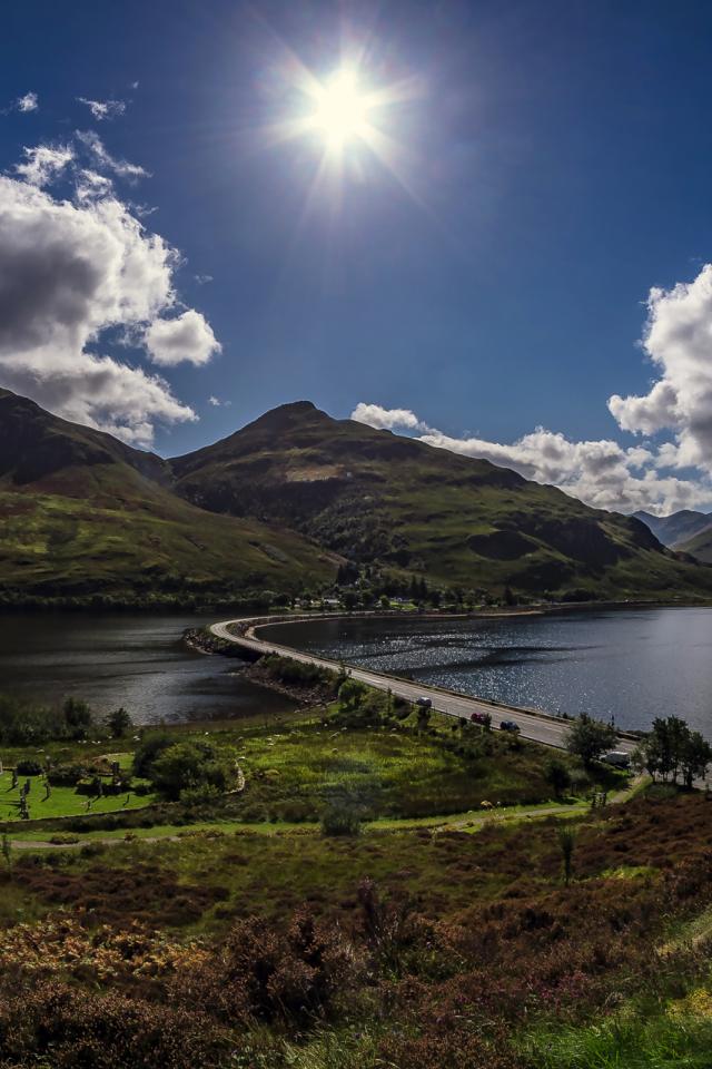 Wallpaper Bright sun in the blue sky over the mountains by the river