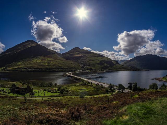 Wallpaper Bright sun in the blue sky over the mountains by the river