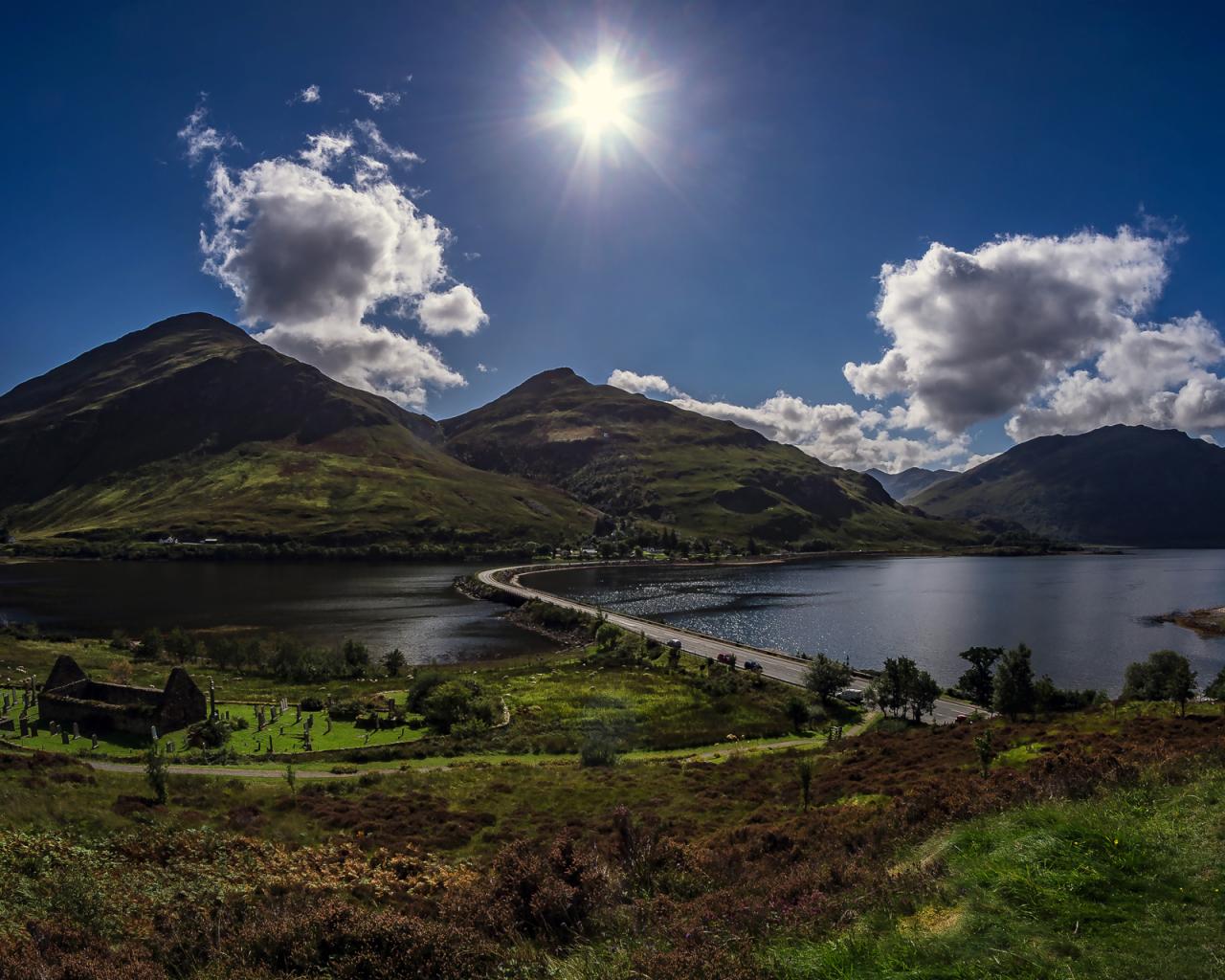 Wallpaper Bright sun in the blue sky over the mountains by the river
