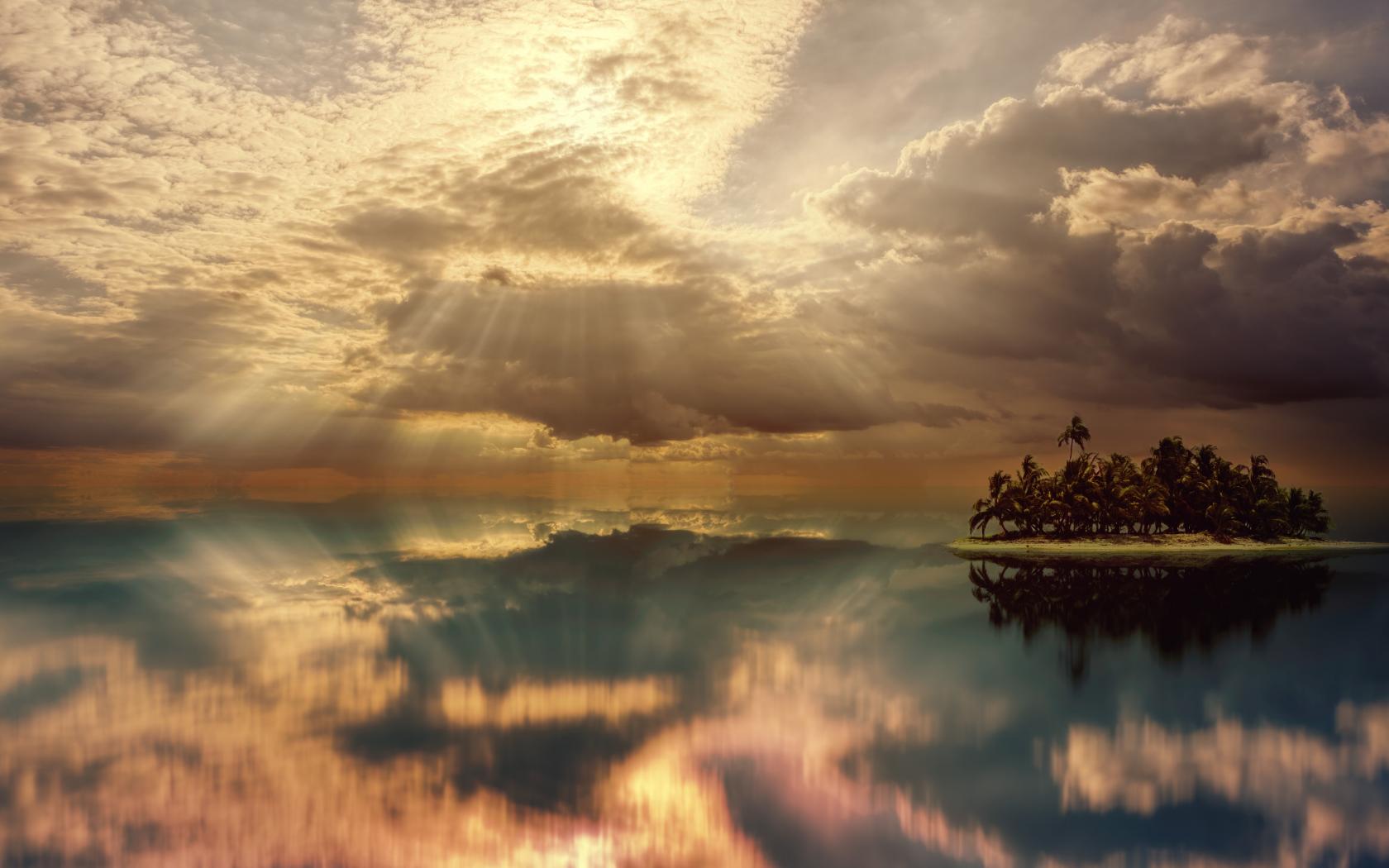 Wallpaper The sun`s rays in the sky fall into the calm water of the lake