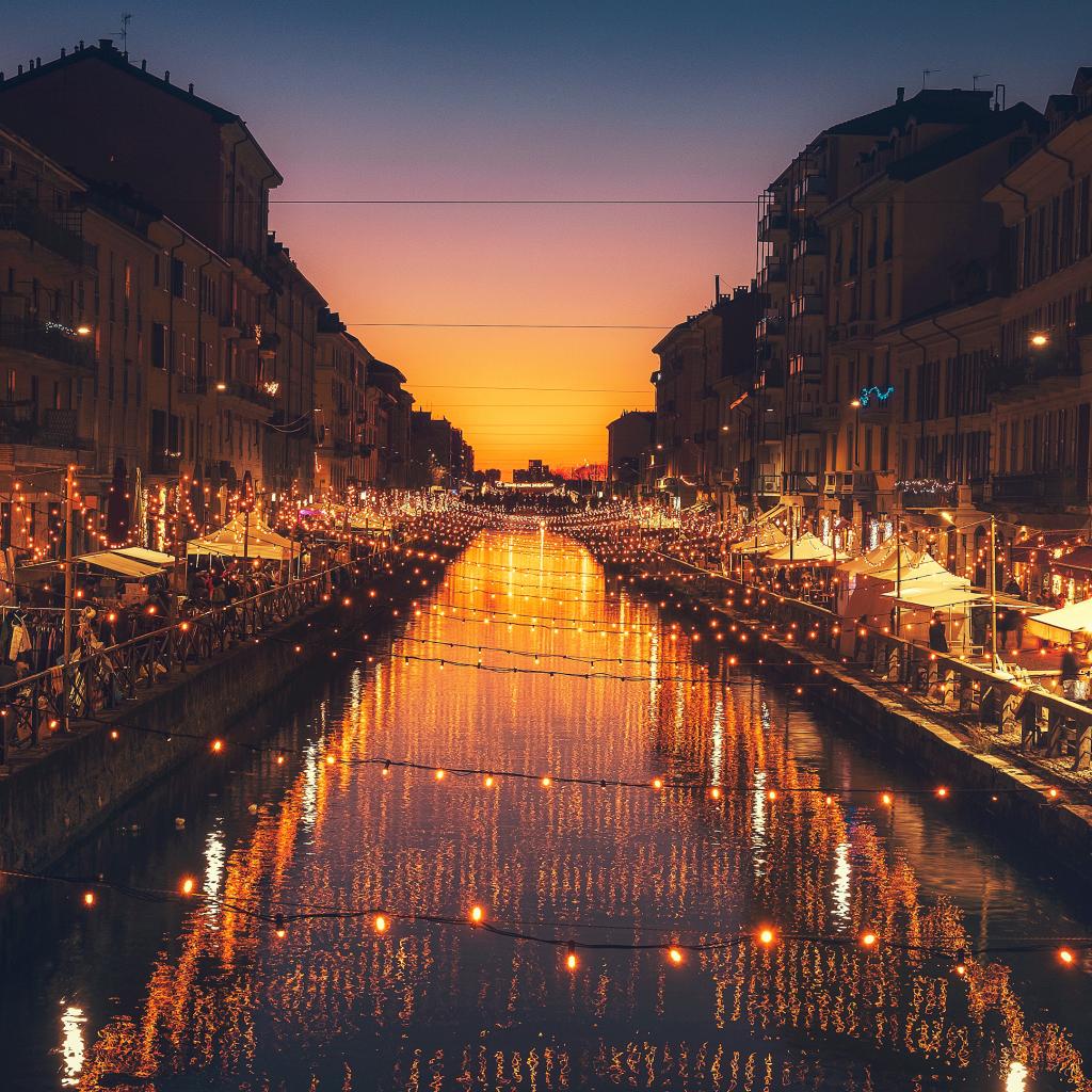 Wallpaper Bright lighted lamps above the water channel