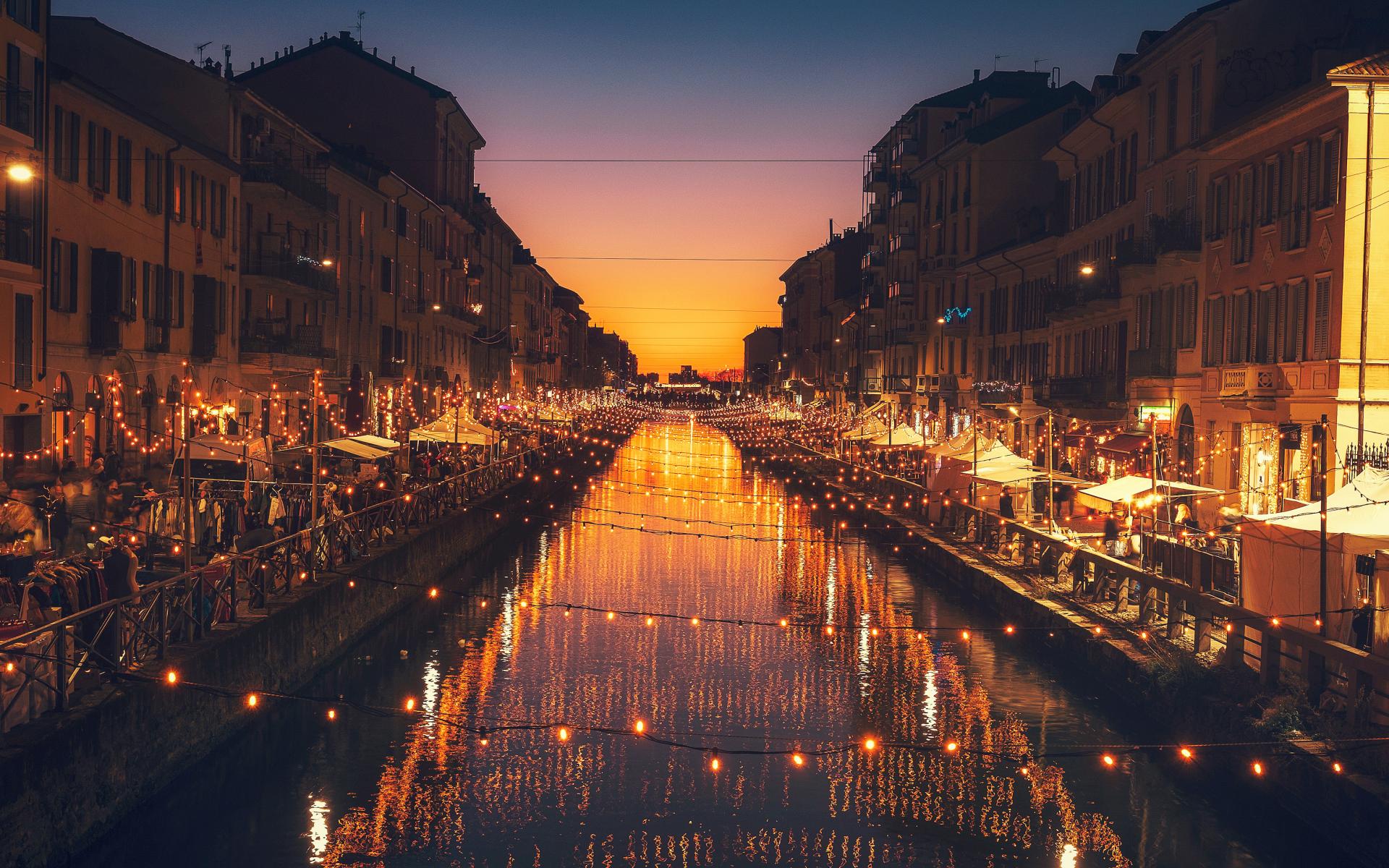 Wallpaper Bright lighted lamps above the water channel