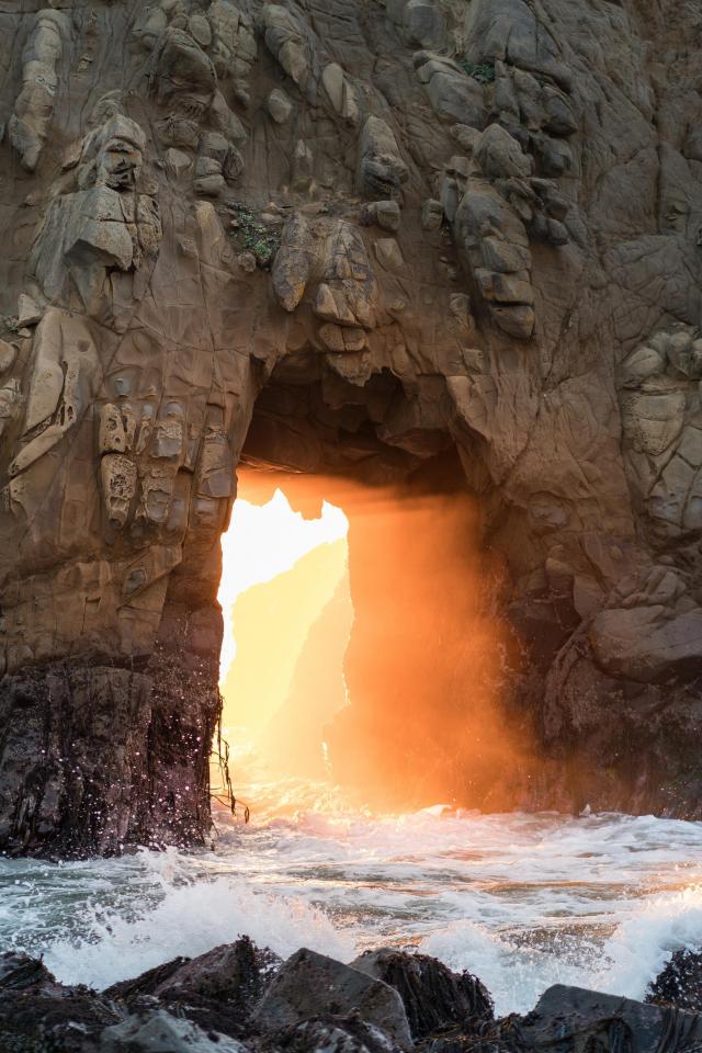 Wallpaper Oval passage in the rock against the backdrop of an orange sky