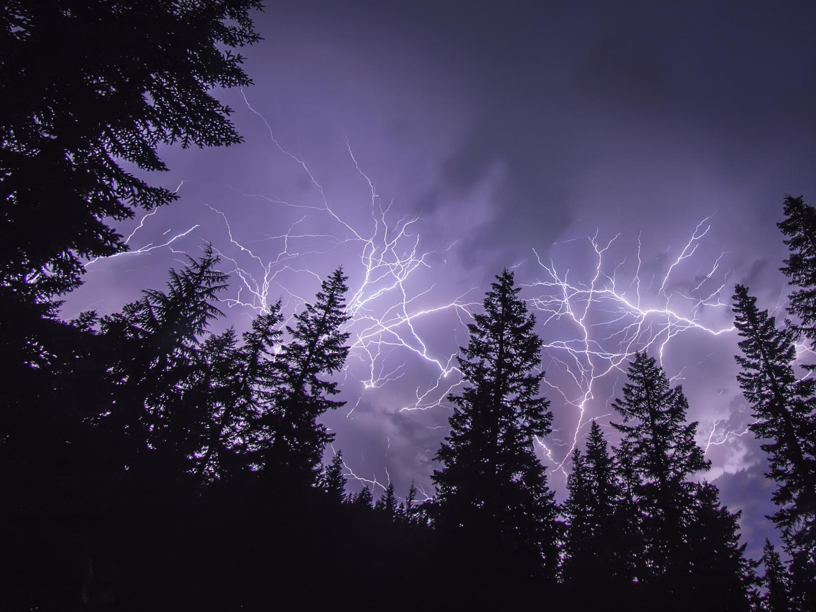 Wallpaper Bright lightning over a pine forest
