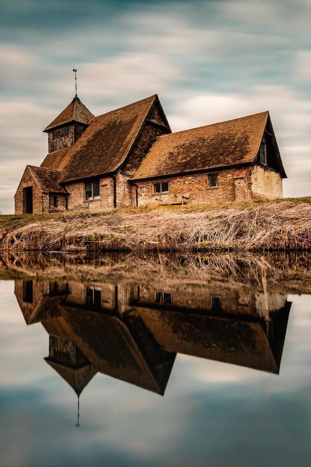 Wallpaper An old house by the river is reflected in the water