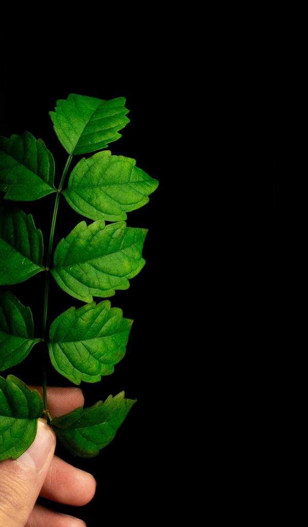 Wallpaper Green leaf in hand on black background