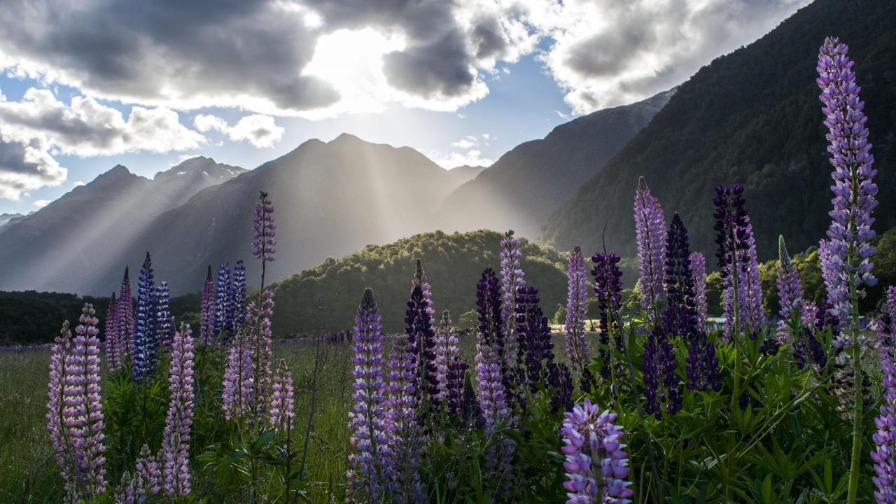 Wallpaper Beautiful lupins at the foot of the mountains in the sun