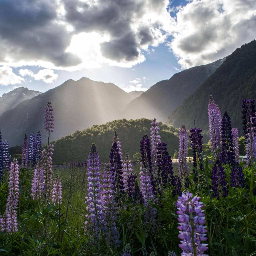 Wallpaper Beautiful lupins at the foot of the mountains in the sun