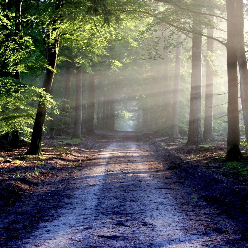 Wallpaper Wet road in the forest in the sun near the green trees