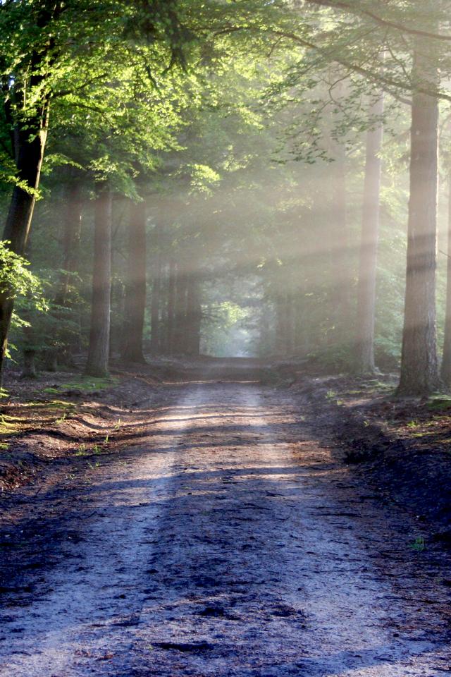 Wallpaper Wet road in the forest in the sun near the green trees