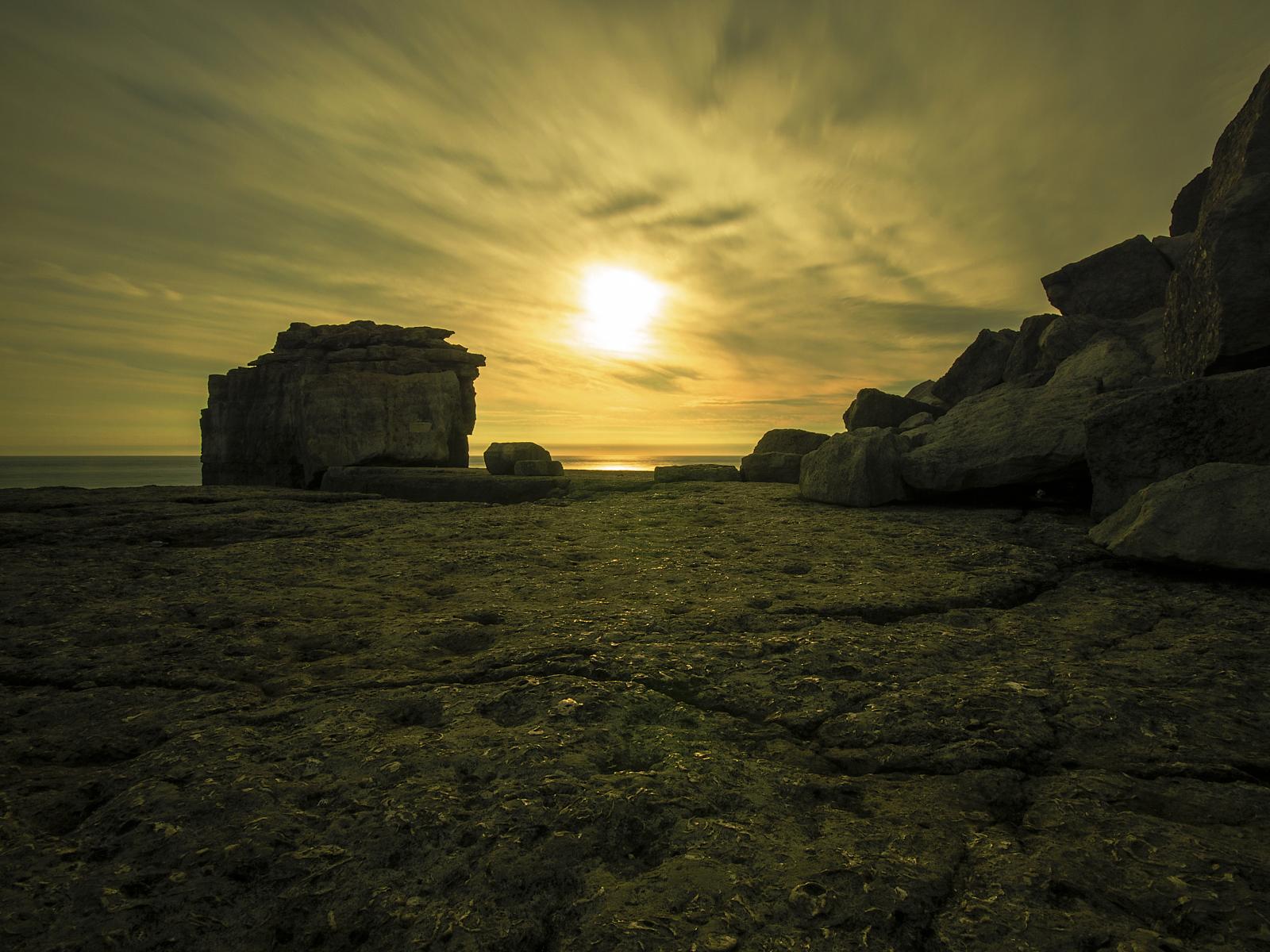 Wallpaper The sun in the clouds illuminates the stones by the sea