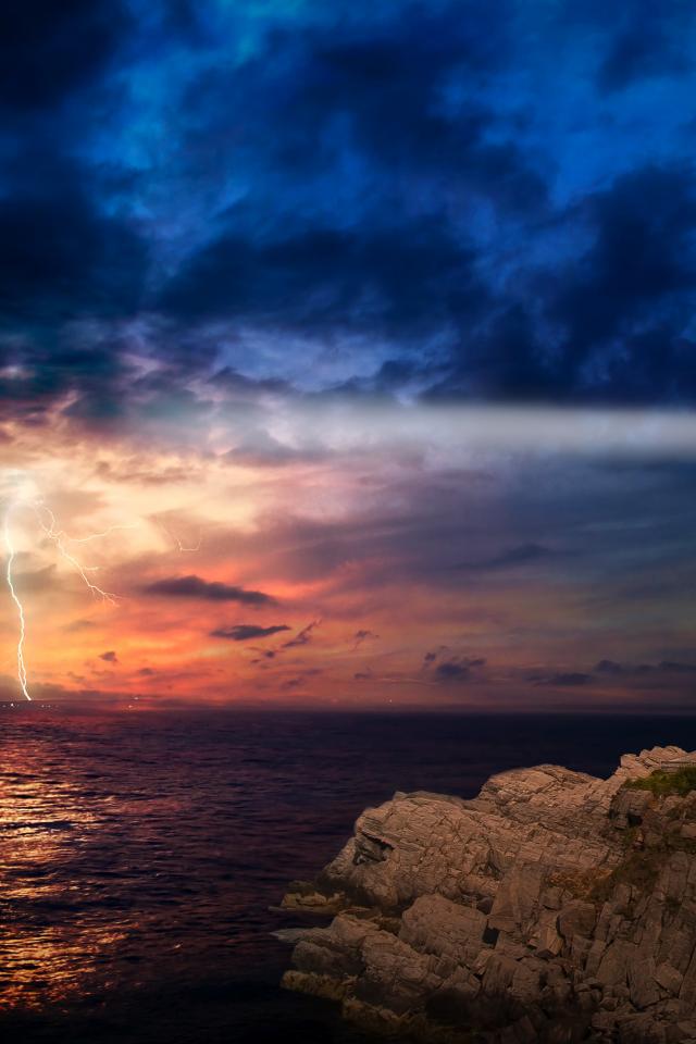 Wallpaper A lighthouse by the sea illuminates a stormy sky
