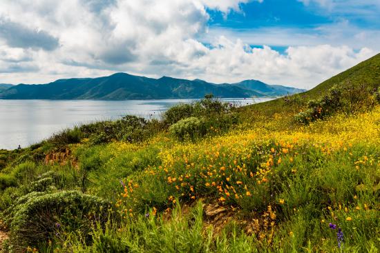 Wallpaper Green grass by the lake near the mountains under a blue sky with clouds