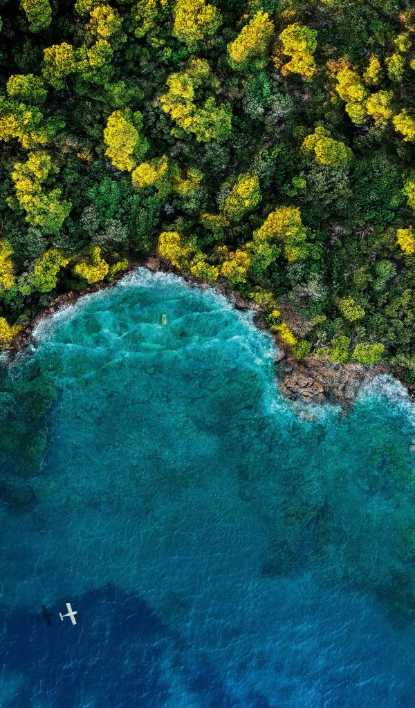 Wallpaper Top view of the blue ocean and green forest, Iceland
