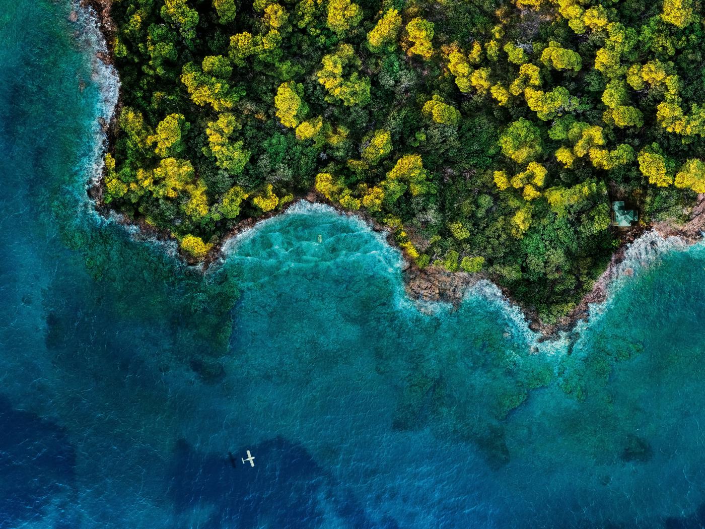 Wallpaper Top view of the blue ocean and green forest, Iceland